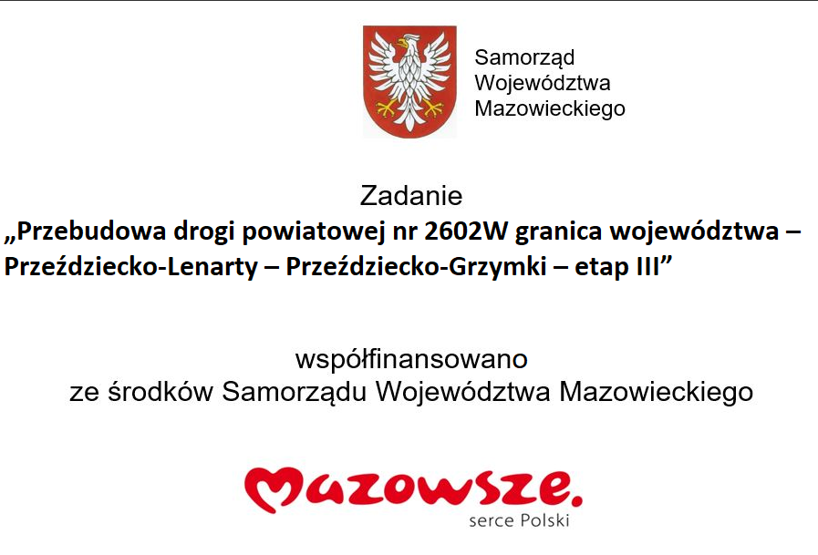 W dniu 9 września 2025 r. przedstawiciele władz Powiatu Ostrowskiego podpisali również umowę z Wykonawcą na realizację zadania pn. „Przebudowa drogi powiatowej nr 2602W granica województwa – Przeździecko-Lenarty – Przeździecko-Grzymki – etap III” na odcinku o długości 550,00 m.