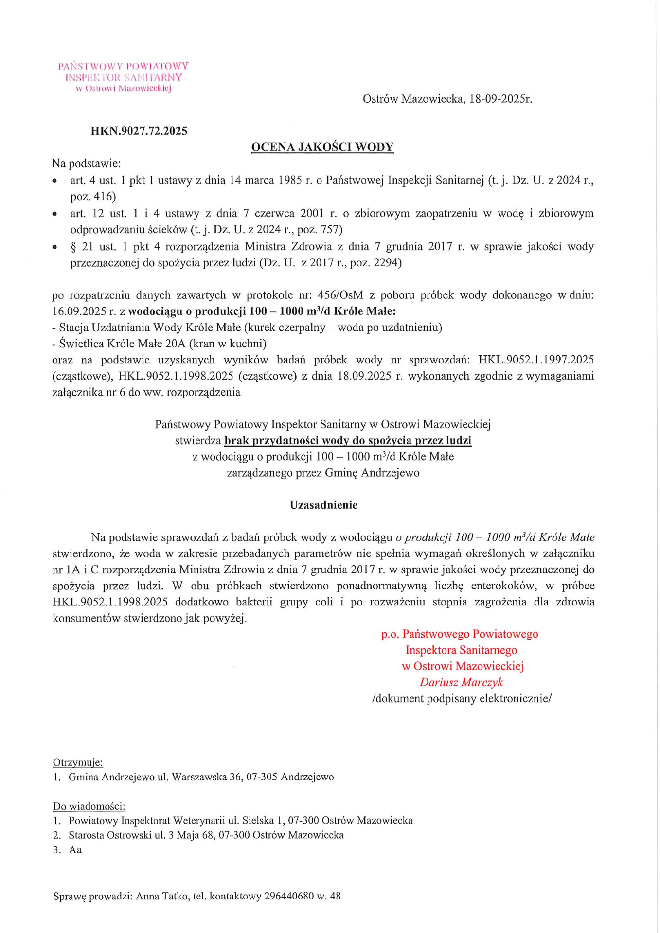Uwaga! Komunikat Państwowego Powiatowego Inspektora Sanitarnego w Ostrowi Maz. w sprawie jakości wody z wodociągu Króle Małe