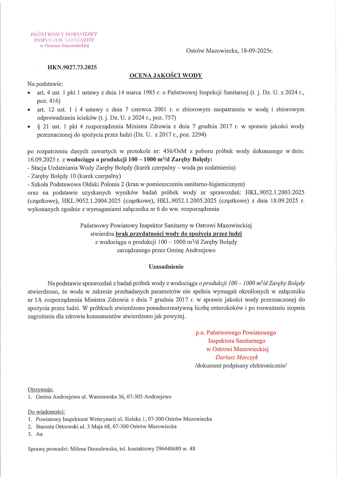 Uwaga! Komunikat Państwowego Powiatowego Inspektora Sanitarnego w Ostrowi Maz. w sprawie jakości wody z wodociągu Zaręby Bolędy