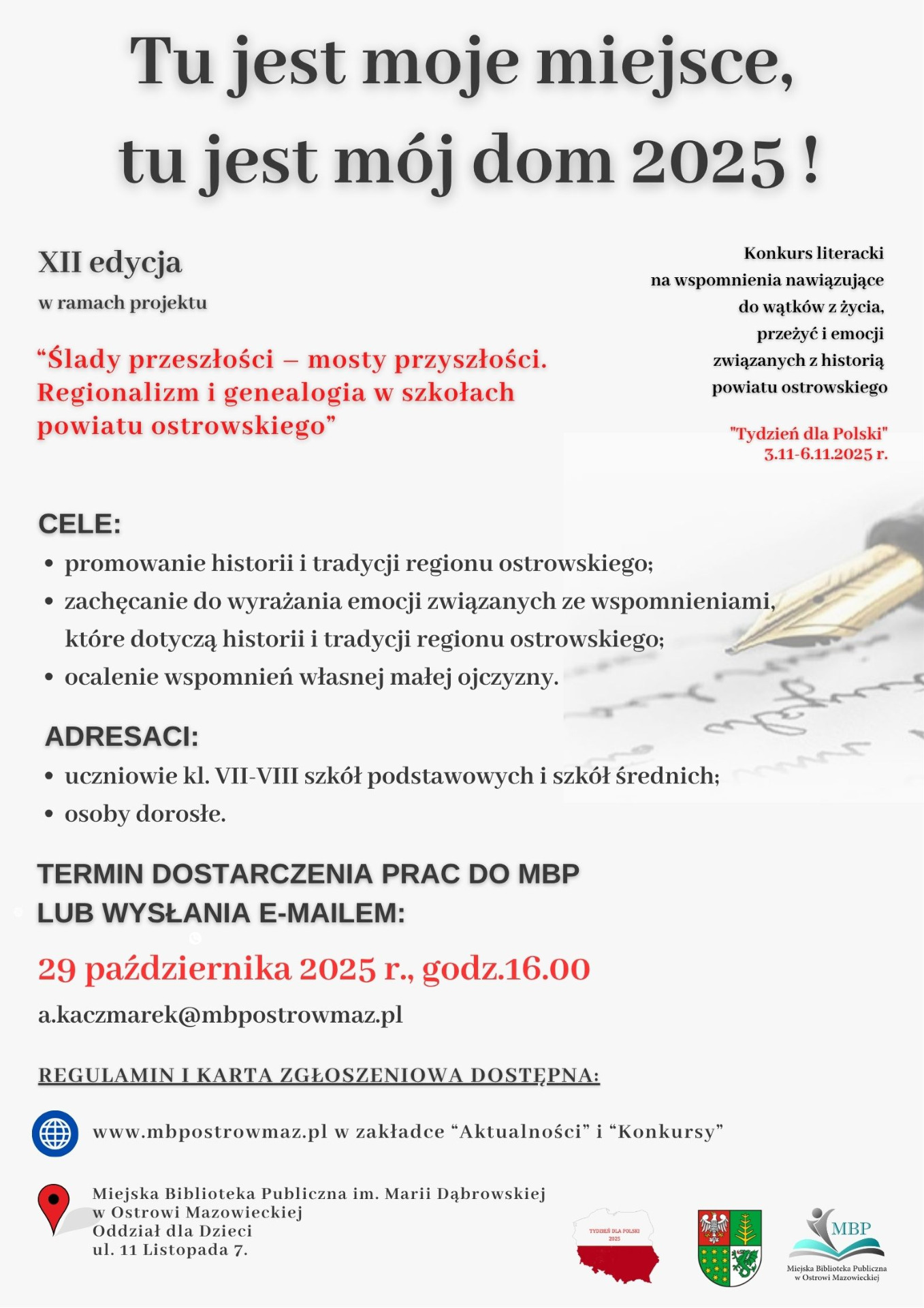 Serdecznie zapraszamy do uczestnictwa w XII edycji konkursu literackiego „Tu jest moje miejsce, tu jest mój dom” organizowanego przez Powiat Ostrowski razem z Miejską Biblioteką Publiczną w Ostrowi Mazowieckiej w ramach projektu: „Ślady przeszłości – mosty przyszłości. Regionalizm i genealogia w szkołach powiatu ostrowskiego”