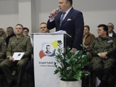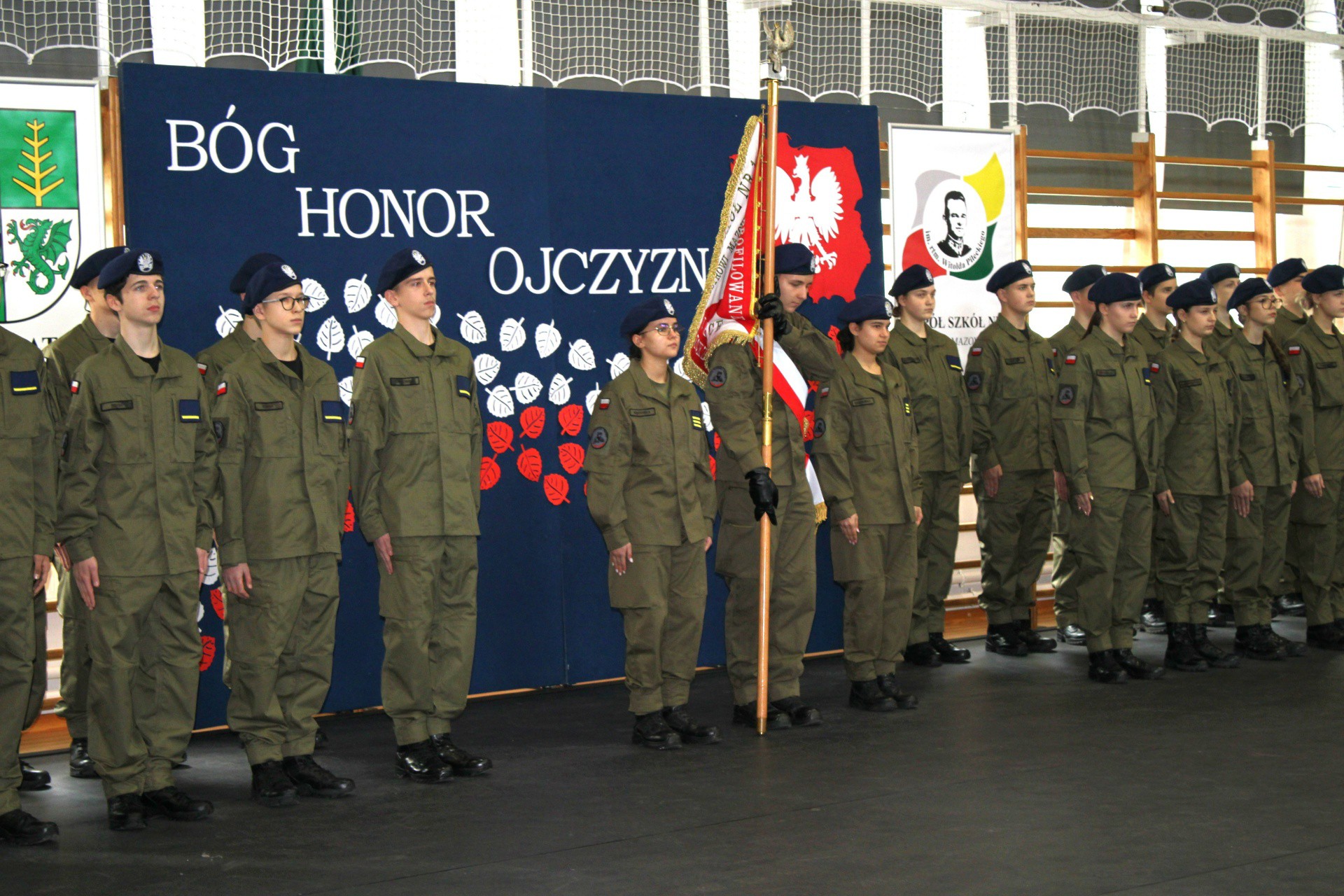 Uroczystość rozpoczęła się od złożenia meldunku przez kadeta Dawida Piórkowskiego, który zameldował Dyrektorowi szkoły gotowość do rozpoczęcia wydarzenia.