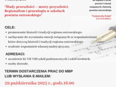 - XII edycja konkursu literackiego "Tu jest moje miejsce, tu jest... czytaj więcejSerdecznie zapraszamy do uczestnictwa w XII edycji konkursu literackiego „Tu jest moje miejsce, tu jest mój dom” organizowanego przez Powiat Ostrowski razem z Miejską...czytaj więcej