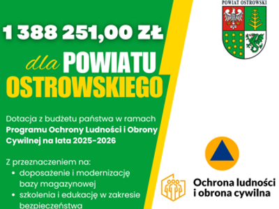 - Prawie 1,4 mln na poprawę bezpieczeństwa w Powiecie Ostrowskim! czytaj więcejPrawie 1,4 mln zł na poprawę bezpieczeństwa w Powiecie Ostrowskim! Powiat Ostrowski otrzyma 1 388 251 zł dotacji z budżetu państwa na działania z zakresu ochrony...czytaj więcej